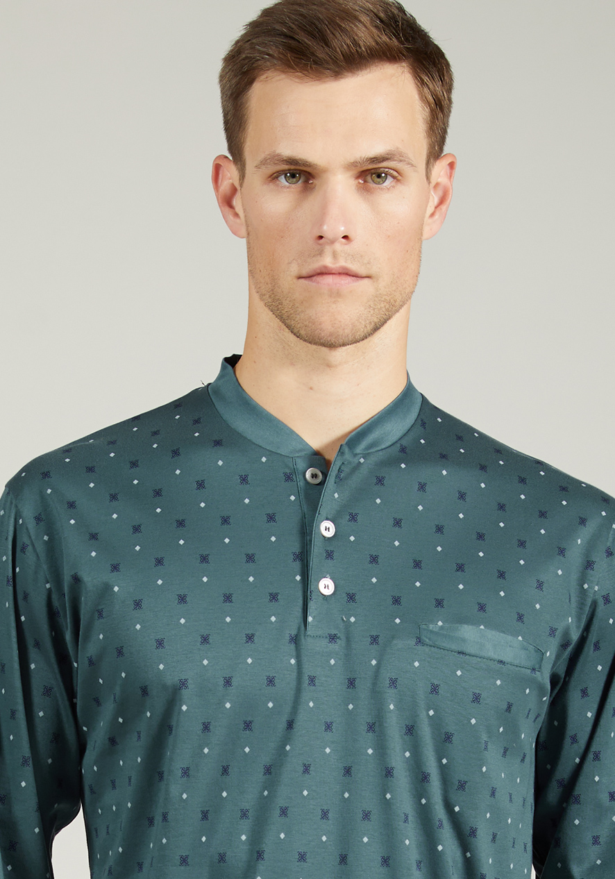 Pigiama uomo dal taglio moderno con eleganti finiture e dettagli. Realizzato con tessuto lucido e setoso , caldo e leggero ideale per chi ama indossare il pigiama senza sentirlo addosso. Realizzato in Italia con tessuto interlock doppia maglia cotone. Vestibilità confortevole. Modello girocollo con bottoni per l'apertura. e taschino sulla casacca.